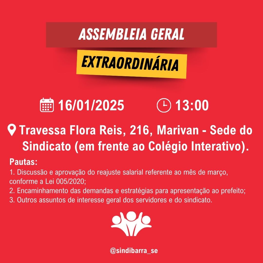 O Sindicato dos Servidores Públicos Municipais de Barra dos Coqueiros convoca todos os servidores para uma Assembleia Geral Extraordinária, que será realizada no dia 16 de janeiro de 2025, às 13h, na sede do sindicato.
