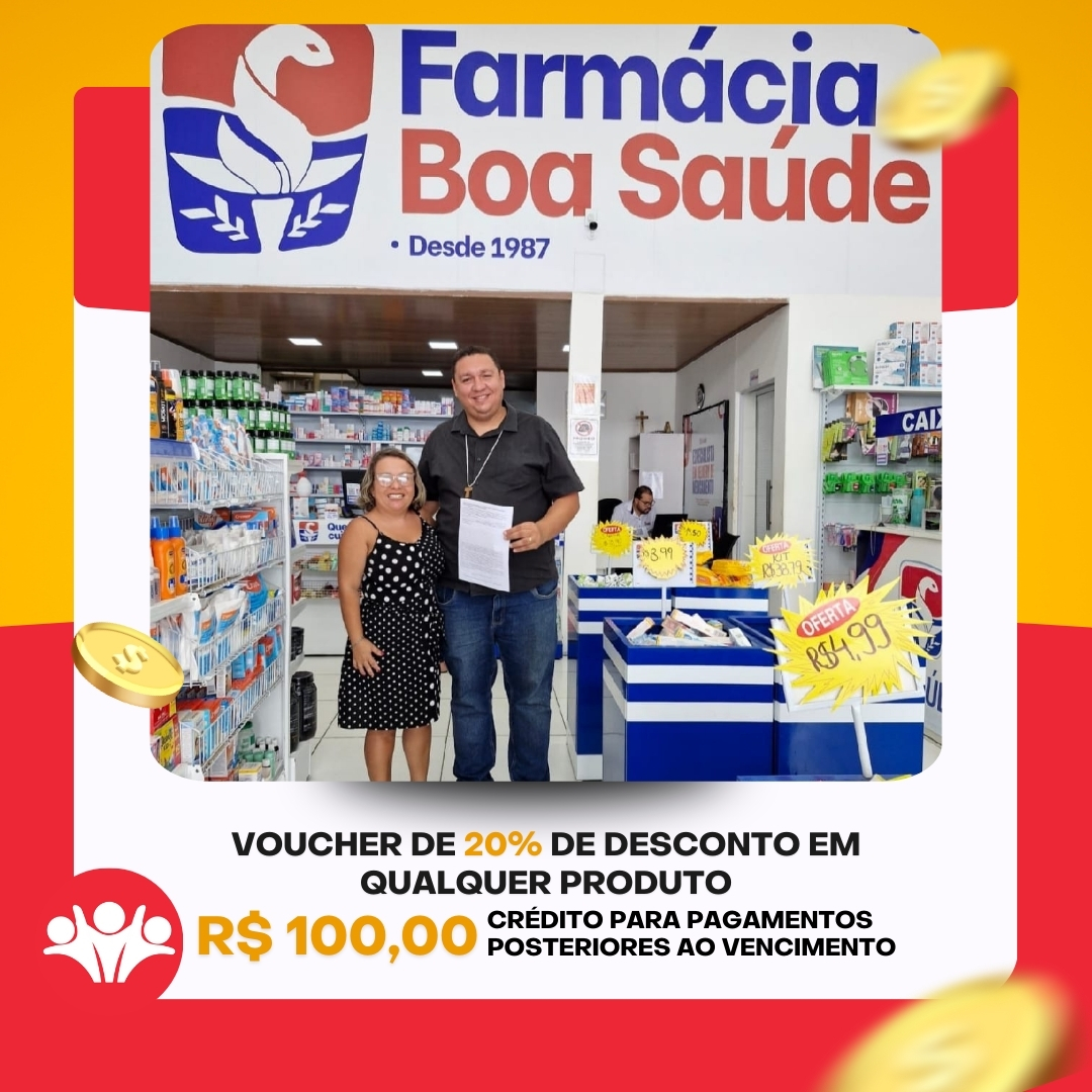 Fechamos mais uma parceria com a Farmácia Boa Saúde! Agora, além do crediário no valor de R$ 100 para pagamento posterior com vencimento, a farmácia também disponibilizou um voucher de 20% de desconto em qualquer produto, incluindo: